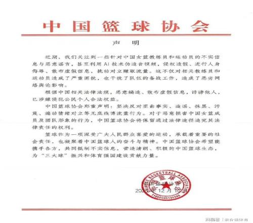 就在昨天晚上,中国篮协发表了重要声明,坚决反对近期传出的一则谣言,因为在网络上有一个视频引起了很大的争议。那就是有人伪造视频。说王思雨和中国女篮的主教练宫鲁鸣出现了一些矛盾,尤其是关于人员的安排以及奖金分布。并且还说他受到了打压,这个视频被广泛传播,已经引发了很恶劣的影响,于是中国篮协发表了重磅声明,坚决反对这种谣言,并且证明这个视频是假的,中国女篮被恶意抹黑,实话实说,